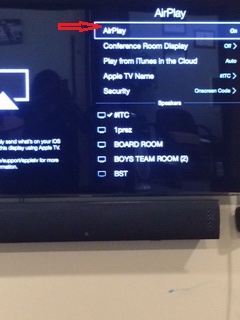 Next, make sure AirPlay is on. If not, select it to turn it on. Shortly your classroom should be visible in the list.
