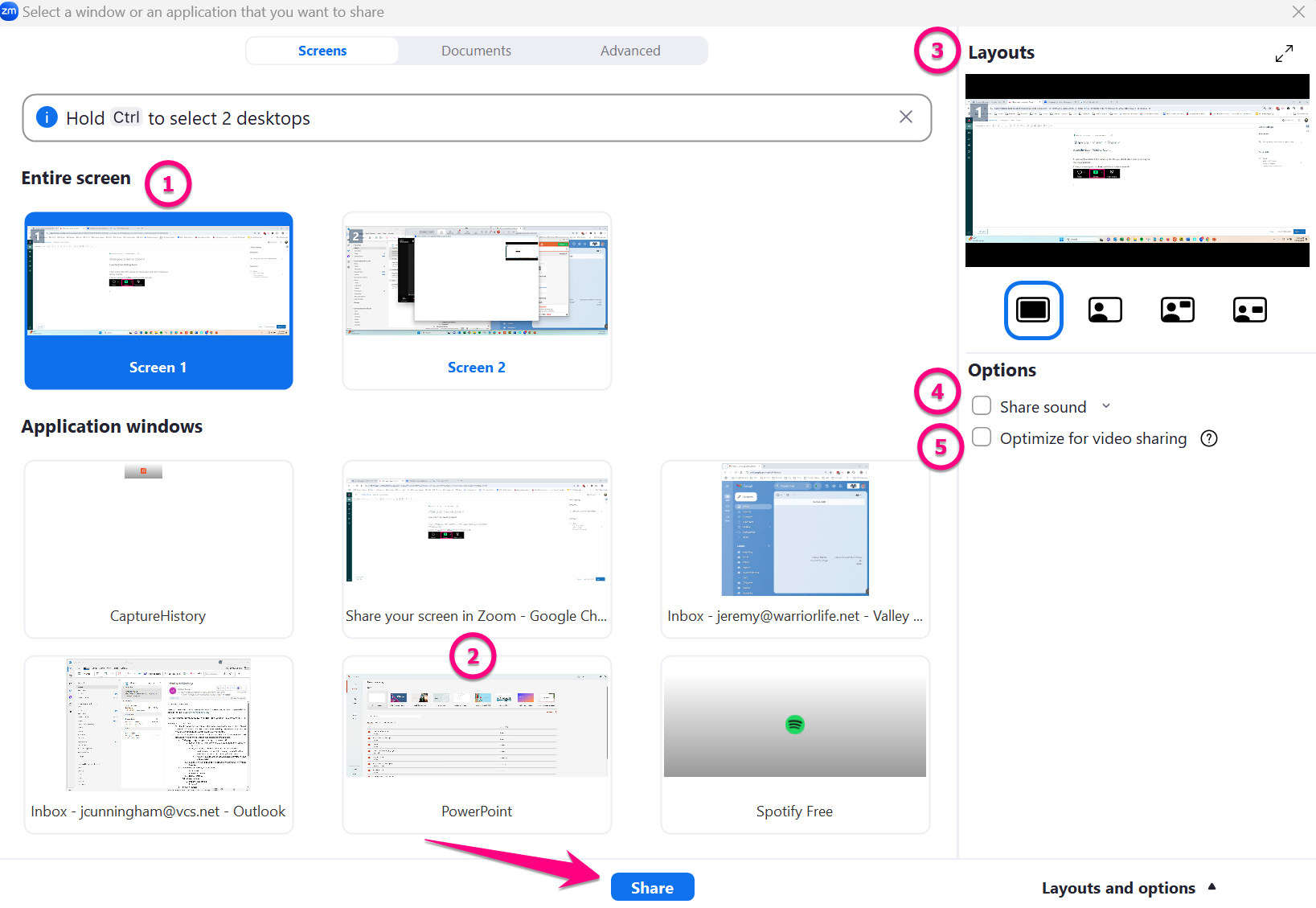 - Choose a Layout for how you want yourself to appear with the shared screen.