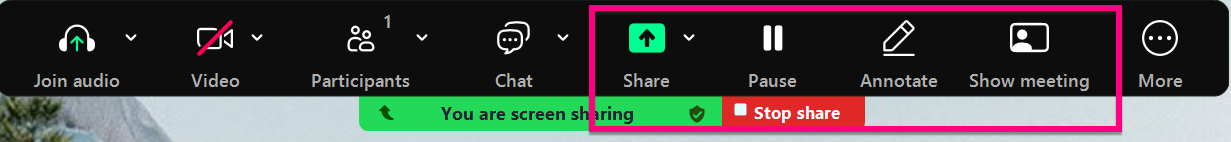 4. Use the floating meeting controls while you share to share a annotate, pause, stop, or start sharing a new window.